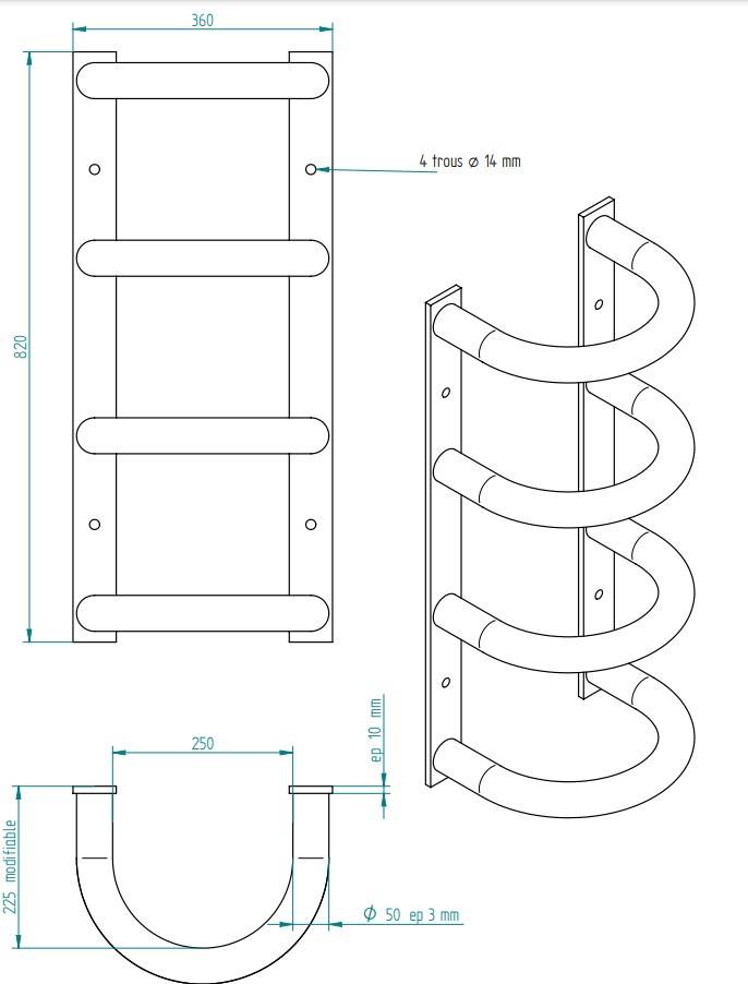 Fixation : platine 820×60 mm ép 10 mm ,2 trous D14 (x2)